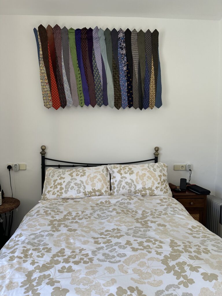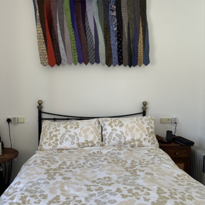 Using all of her husband's beautiful and eclectic collection of ties, Anne commissioned me to create a hanging to go above their bed and here it is looking right at home: