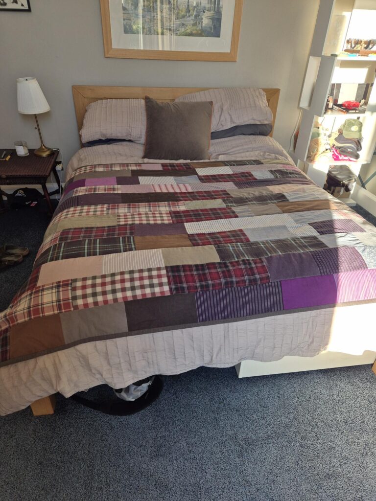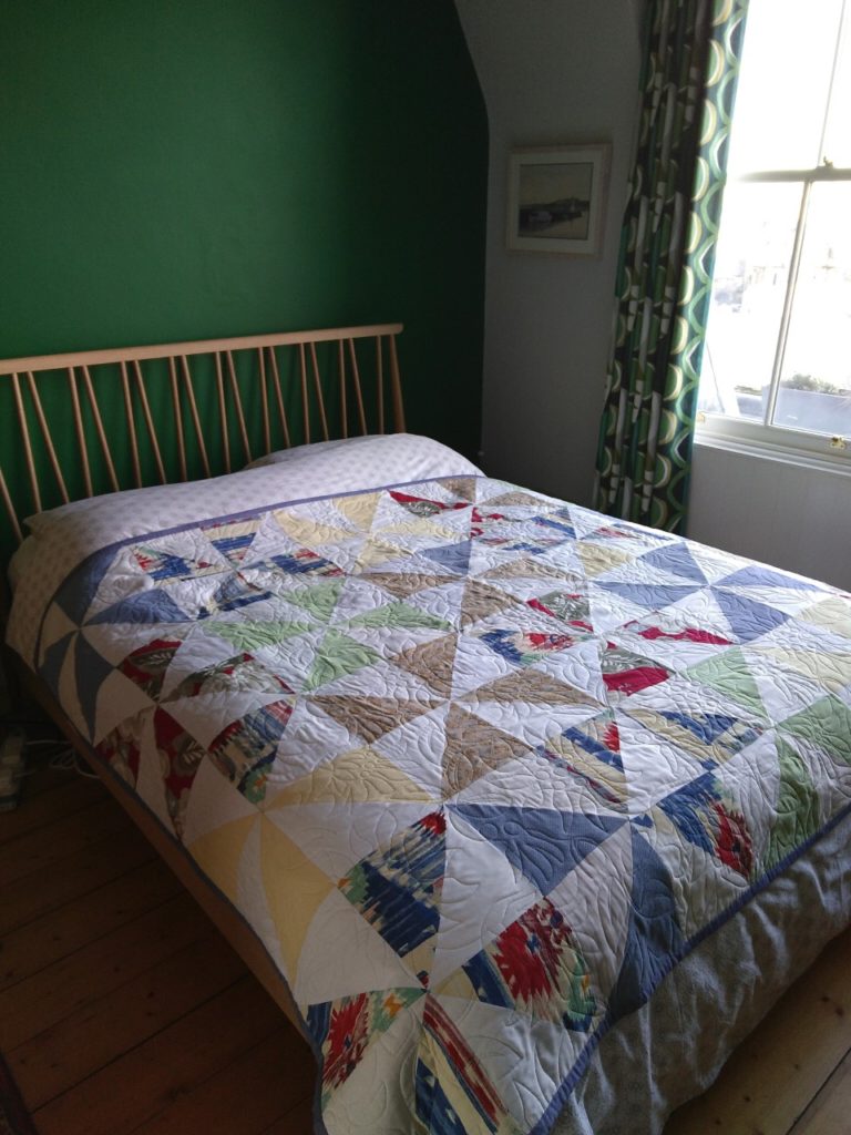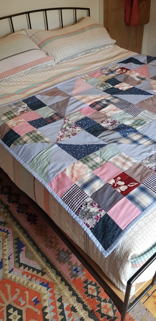 I found it super easy to work out through conversation and zooms of the room what I wanted from the quilt. This was a process that Lisa led and managed really well. I am also impressed by the way she arranged the strong colours in the shirts to come up with something that is really striking. And her advice on backing and stitching helped me to visualise better what I wanted.