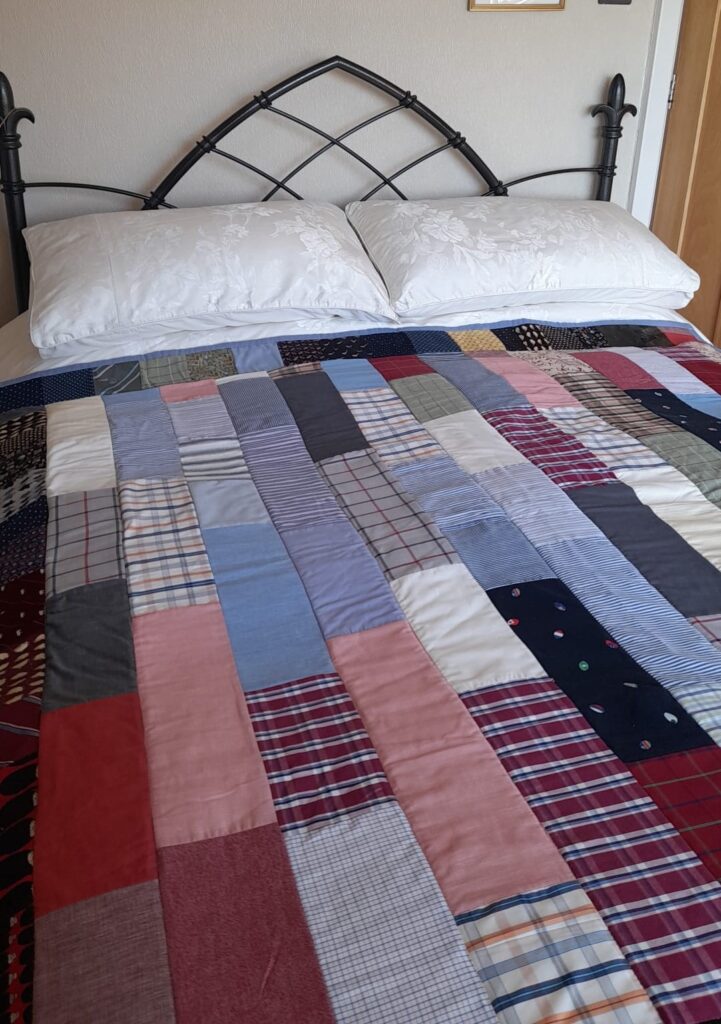 Chris sent me a big box full of shirts and ties that her husband wore. There were lots of wonderful fabrics to work with and following a discussion on the quilt design, I enjoyed the whole making process, even when working with silk which can be challenging to stitch. The strip style quilt surrounded by a border worked well at combining all the delicious mixture of colours and fabrics into one bespoke quilt in a truly unique memory quilt for Chris.