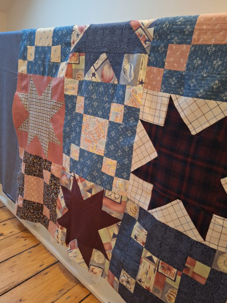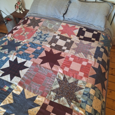 A Star and Irish Chain Patchwork quilt for Eppie using her pa's collection of shirts: