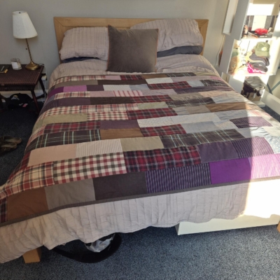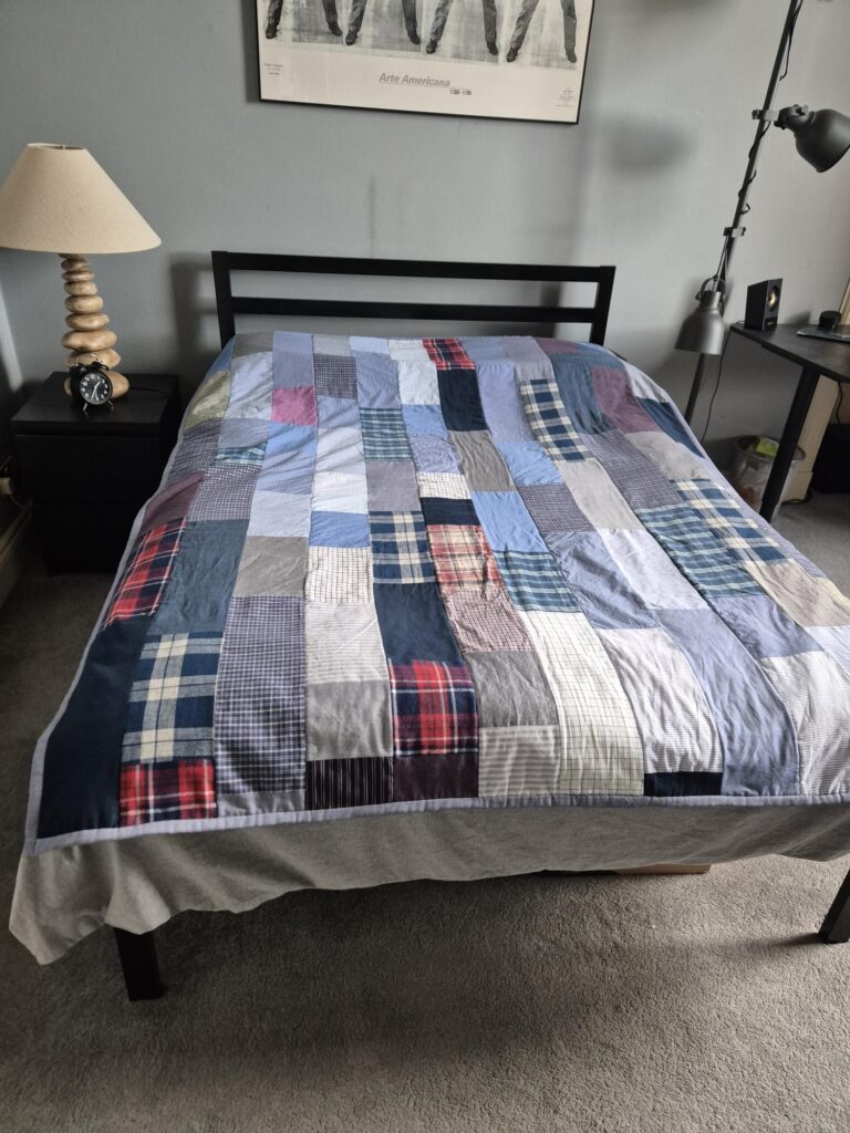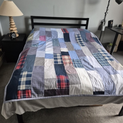 A strip style patchwork quilt for Tracy's son using his father's shirts, ties (& trousers);