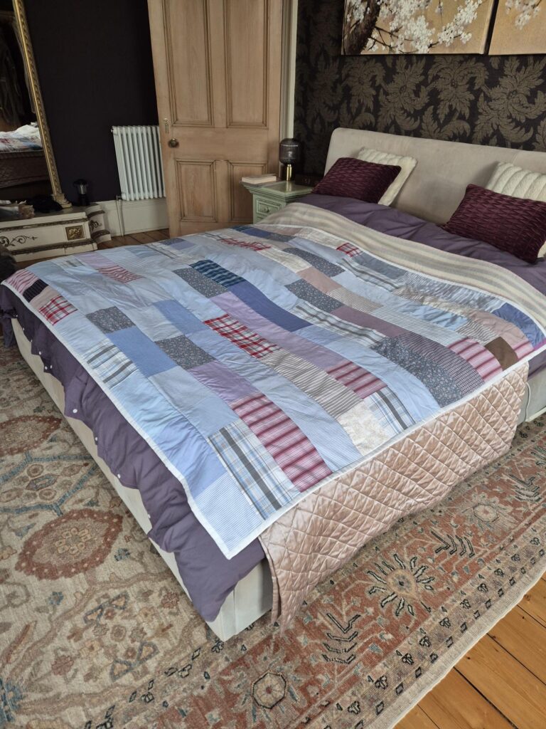 Debbie wished to use all of her father’s amazing collection of ties to create a comforting quilt for her mother, who has just moved into a new flat closeby to Debbie after selling her martial home. Every single tie has been stitched into this quilt to create an eyecatching design. The quilt has been backed and binded in shirting fabric to link in with this tie quilt.