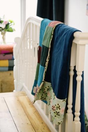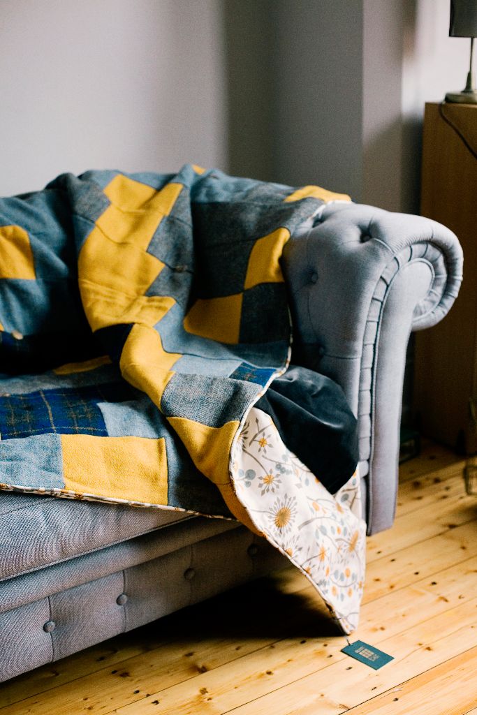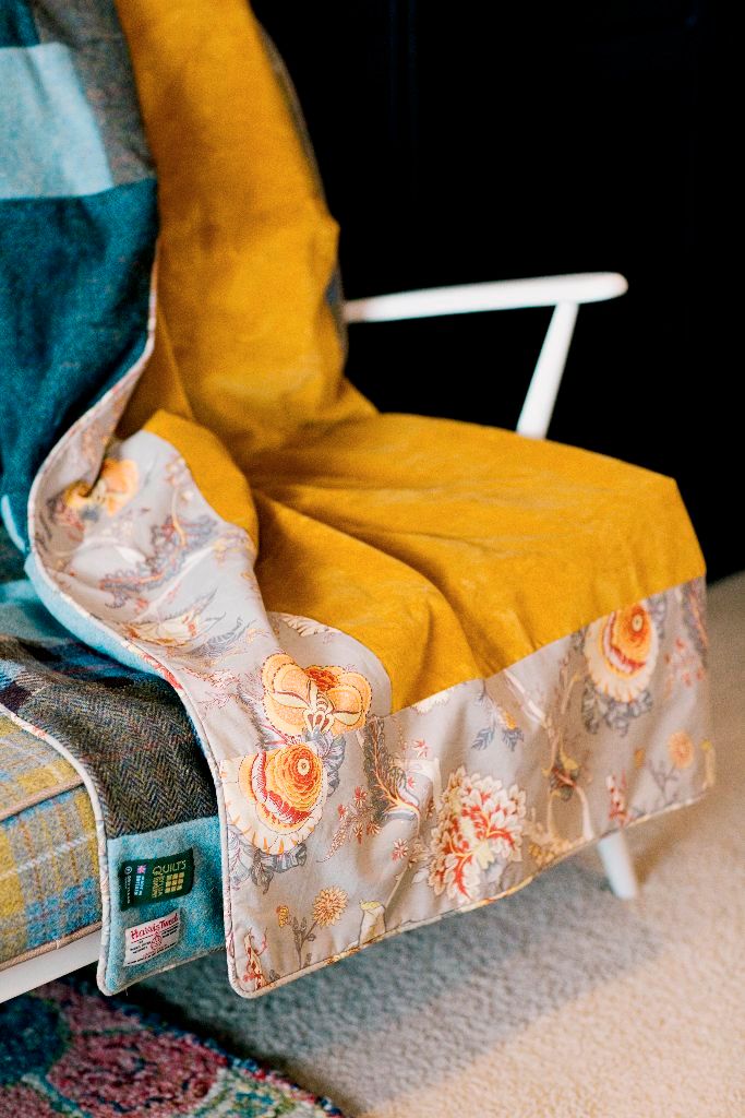 I bought Lisa’s ‘sunshine yellow velvet and subtle blues, browns and greys Harris Tweed, quilt. Just love the fabrics, colour combinations and the workmanship is superb.