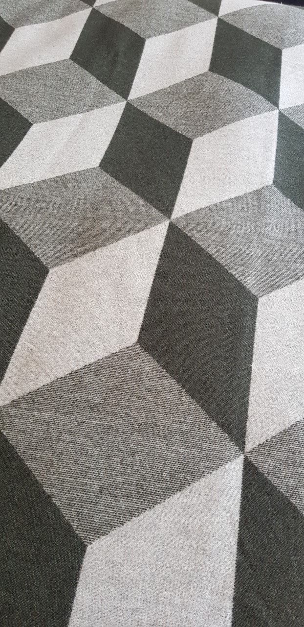 AND NewNew 3-D Tumbling Block Blanket is in an OLive and Ash Colourway with a Turf edging