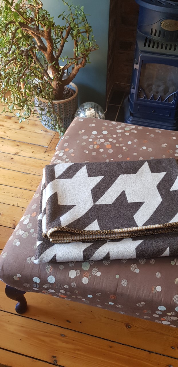 My Houndstooth reversible blanket is now available in Morel and Bleached White colourway (with a Mustard Mead blanket stitch edging)