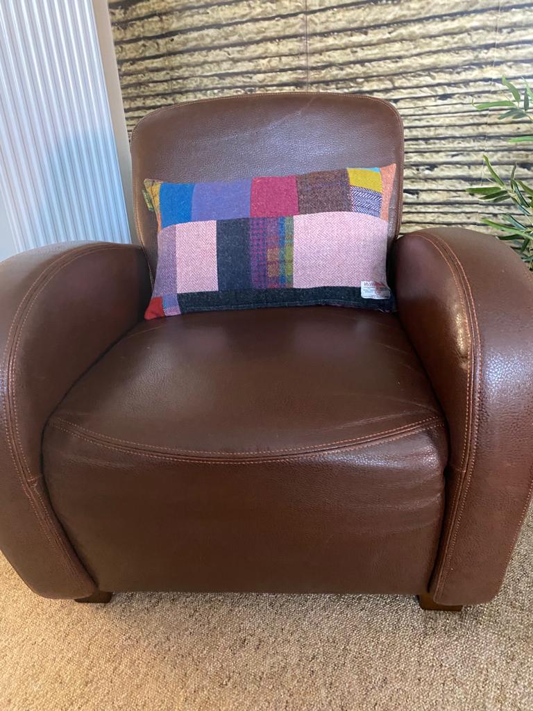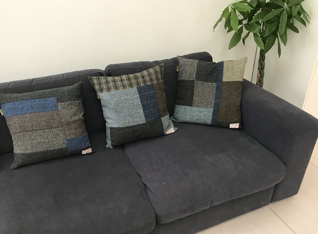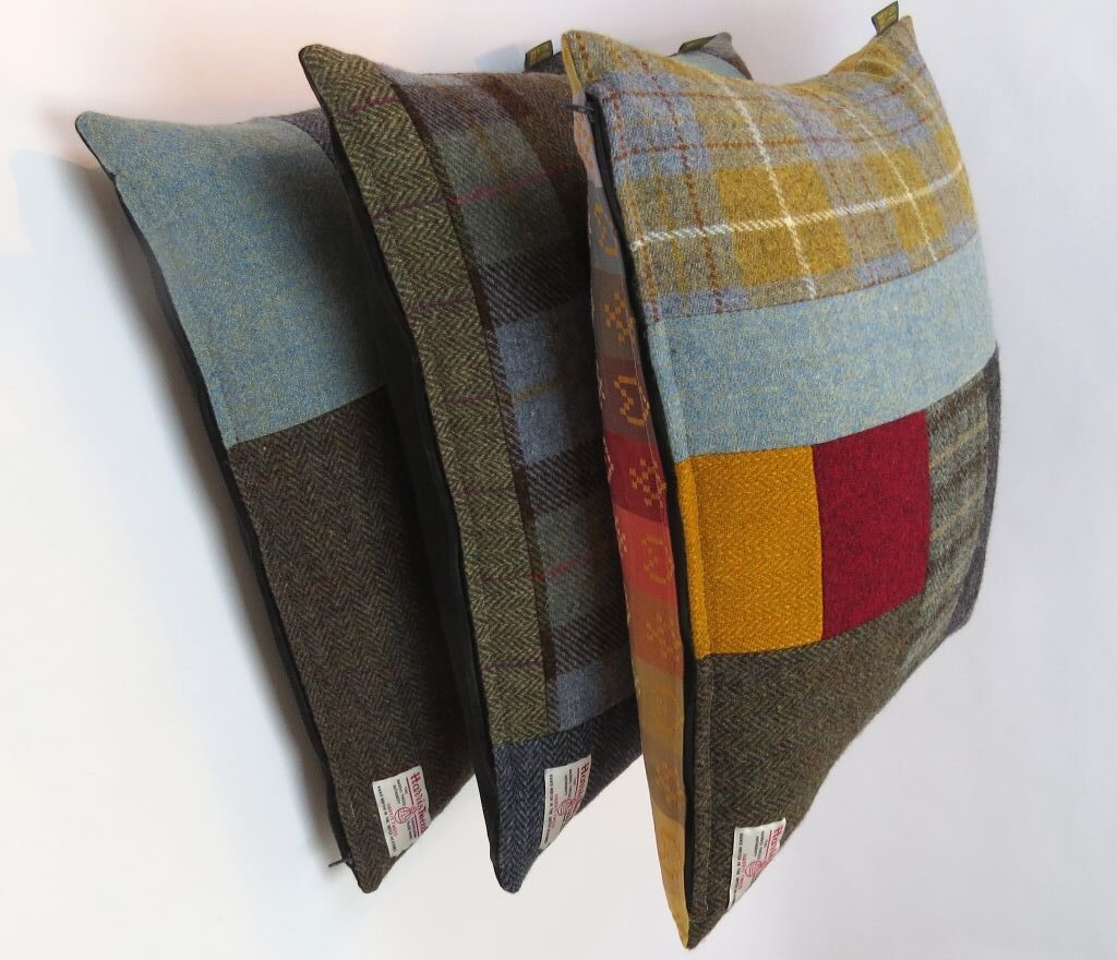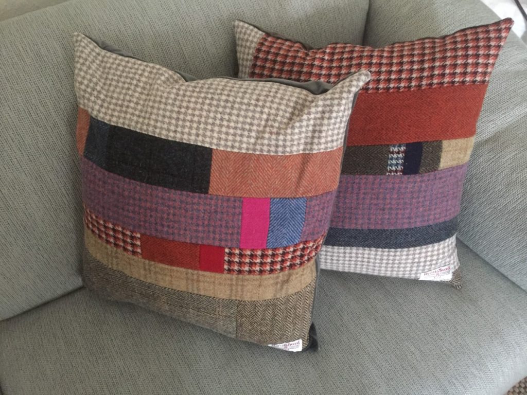 From Helen – June16 My cushion arrived safely yesterday morning. It’s beautiful and I love it loads! This beautiful cushion was a delight to un-wrap. The texture and the red, pink, grey and green colours of the Harris Tweed look perfect on my red leather armchair. The pattern of the blocks of different coloured tweeds give a different look to the cushion depending on which way up you position it .The contrasting reverse of full blown roses on cotton is a brilliant idea. It’s creatively designed, extremely well made and the cover is removable if needed. And it’s comfortable too! Thank you so much. (Sadly I do not have any images of Helen’s Harris Tweed cushion, so I have included images of an equally luxurious one).