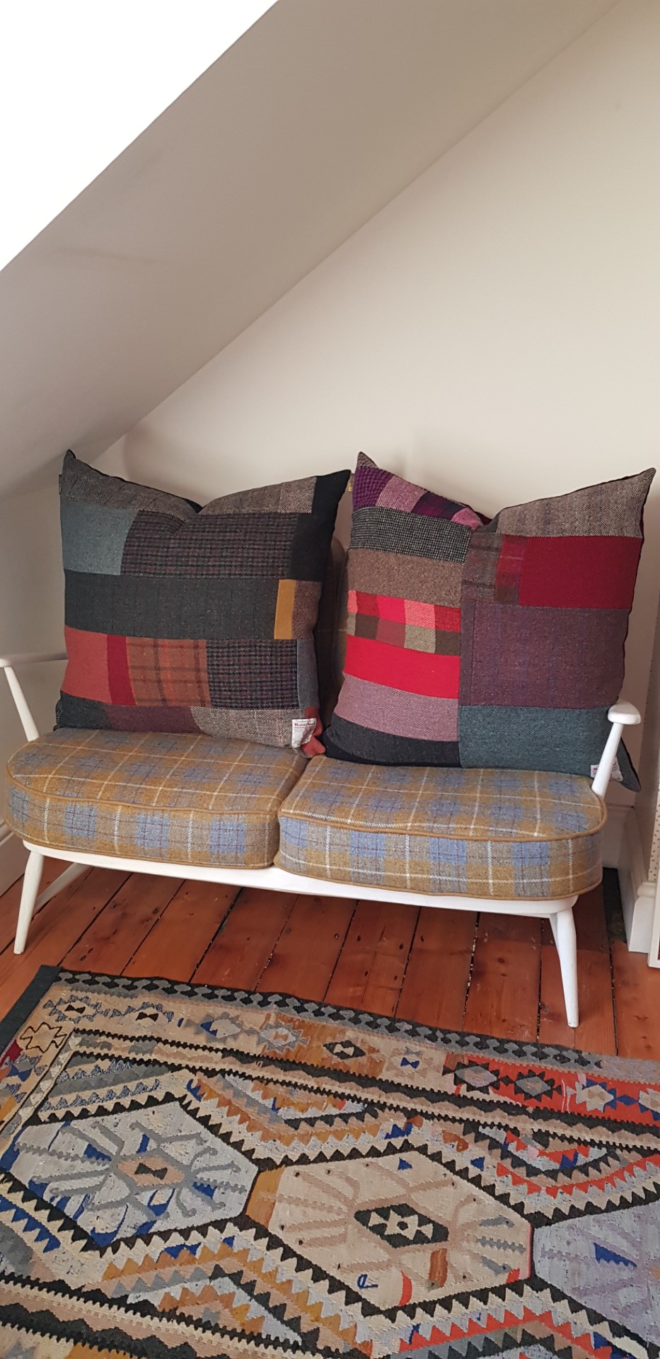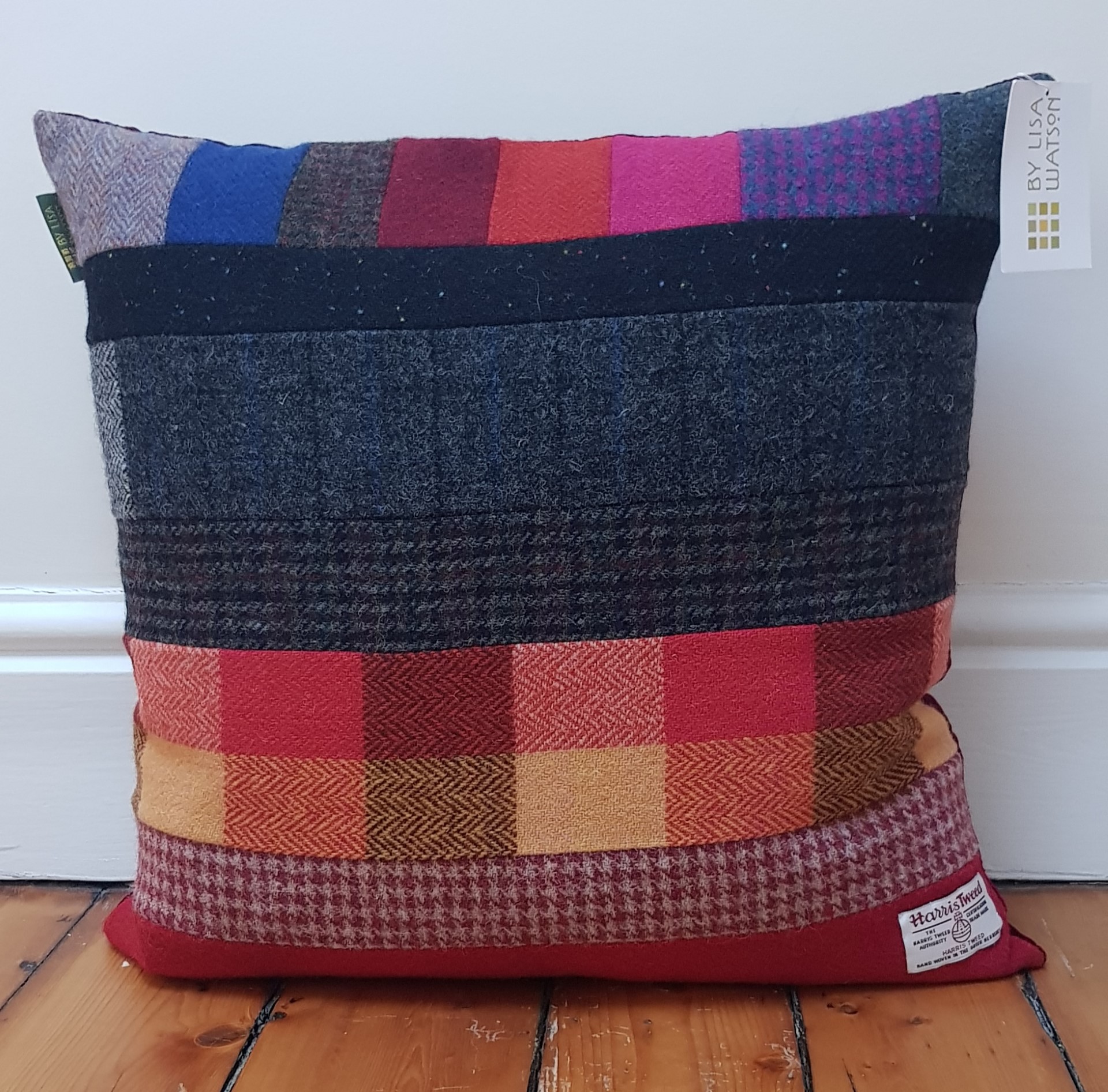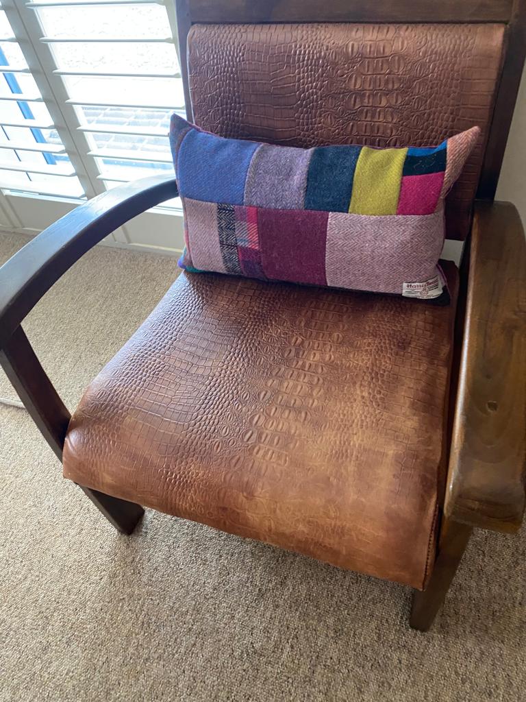From Helen – June16 My cushion arrived safely yesterday morning. It’s beautiful and I love it loads! This beautiful cushion was a delight to un-wrap. The texture and the red, pink, grey and green colours of the Harris Tweed look perfect on my red leather armchair. The pattern of the blocks of different coloured tweeds give a different look to the cushion depending on which way up you position it .The contrasting reverse of full blown roses on cotton is a brilliant idea. It’s creatively designed, extremely well made and the cover is removable if needed. And it’s comfortable too! Thank you so much. (Sadly I do not have any images of Helen’s Harris Tweed cushion, so I have included images of an equally luxurious one).