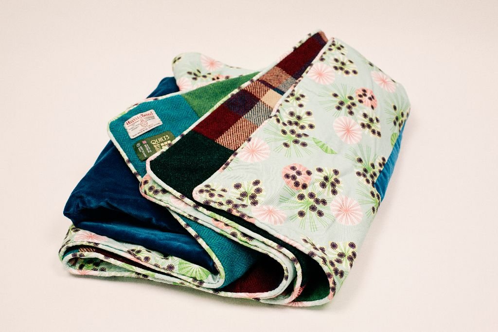 I bought Lisa’s ‘sunshine yellow velvet and subtle blues, browns and greys Harris Tweed, quilt. Just love the fabrics, colour combinations and the workmanship is superb. Don’t normally treat myself to such an opulent gift, but it is worth every penny for the comfort, style and craftsmanship. This as a quilt that will be well used, cherished and passed on through the family.