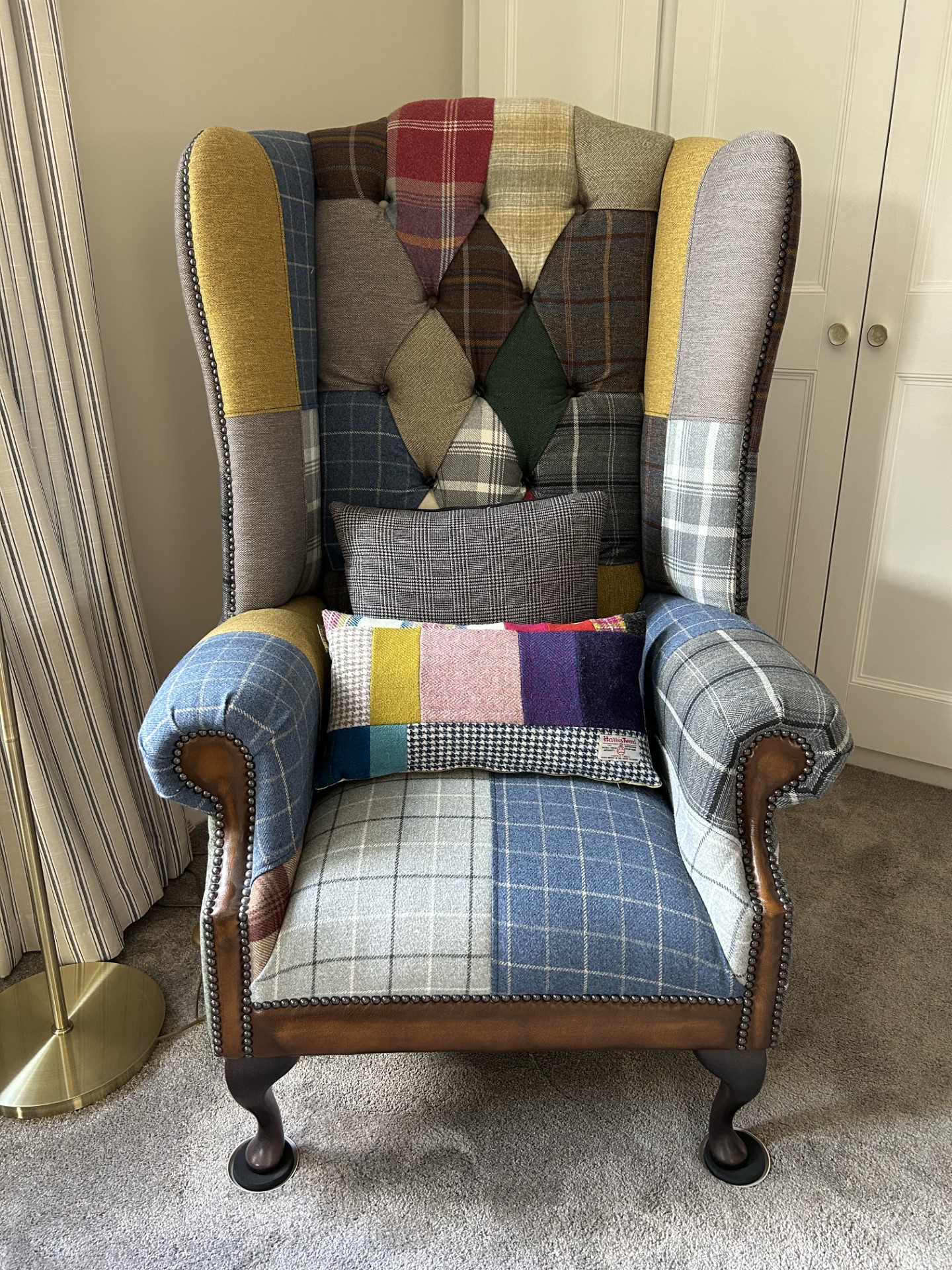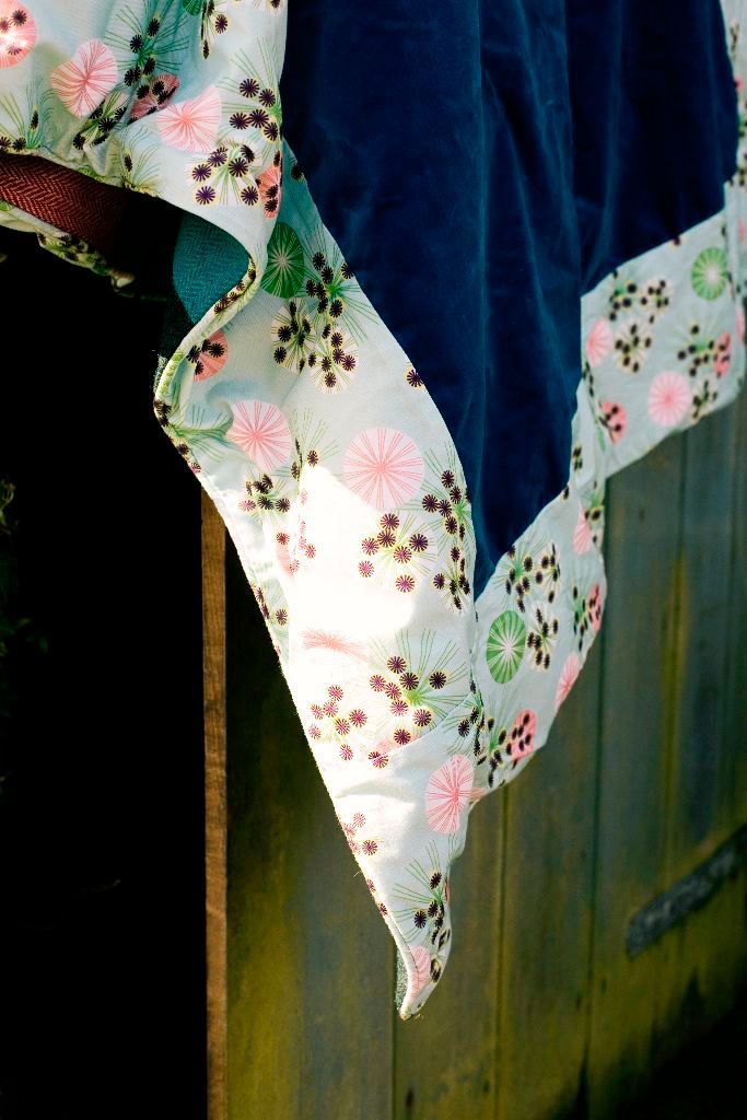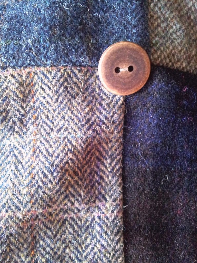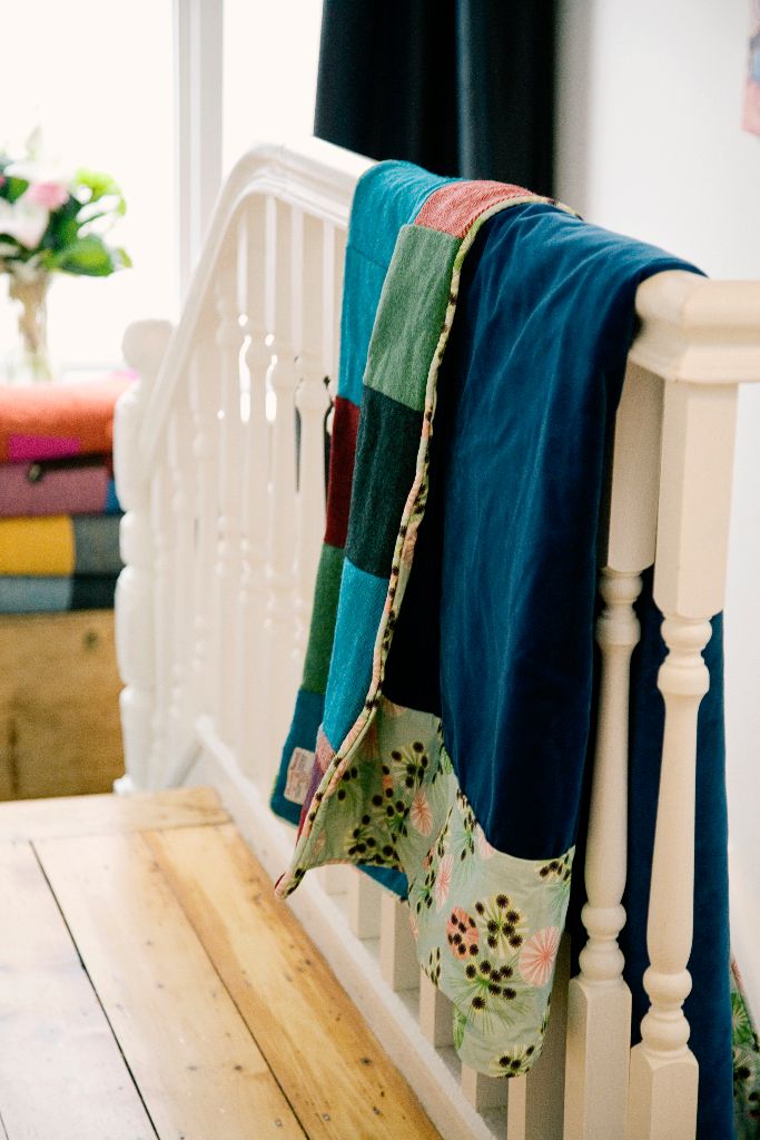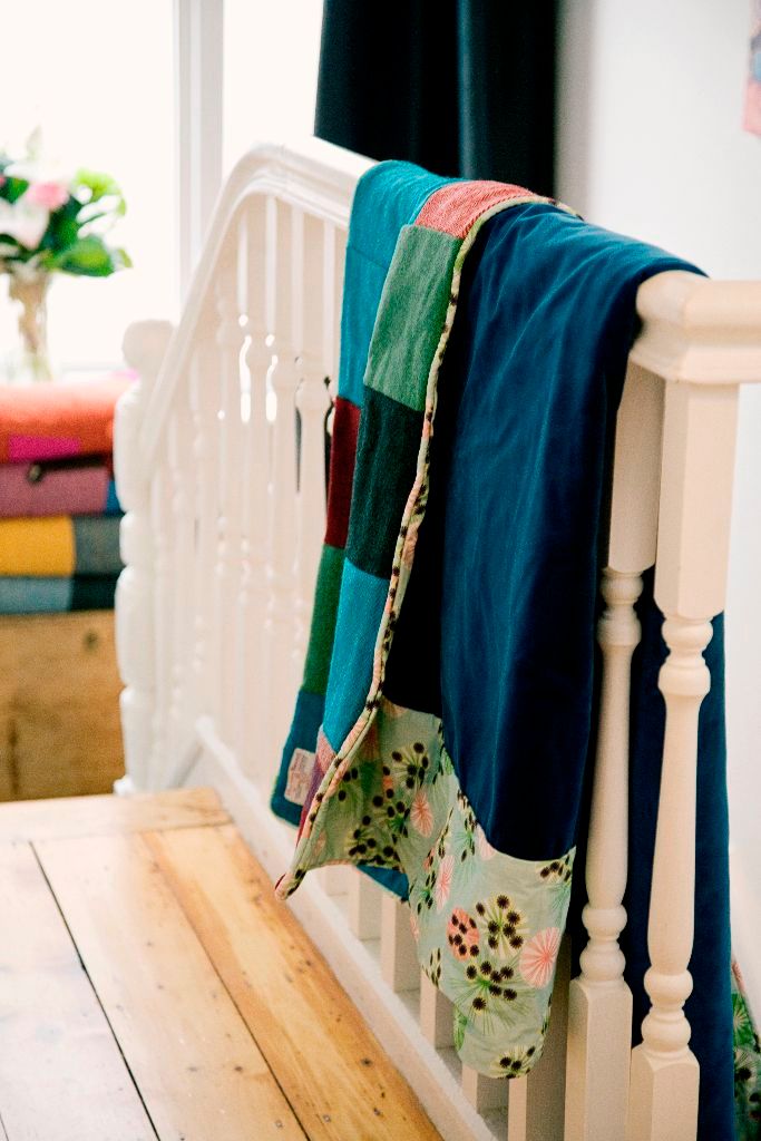 I bought Lisa’s ‘sunshine yellow velvet and subtle blues, browns and greys Harris Tweed, quilt. Just love the fabrics, colour combinations and the workmanship is superb.