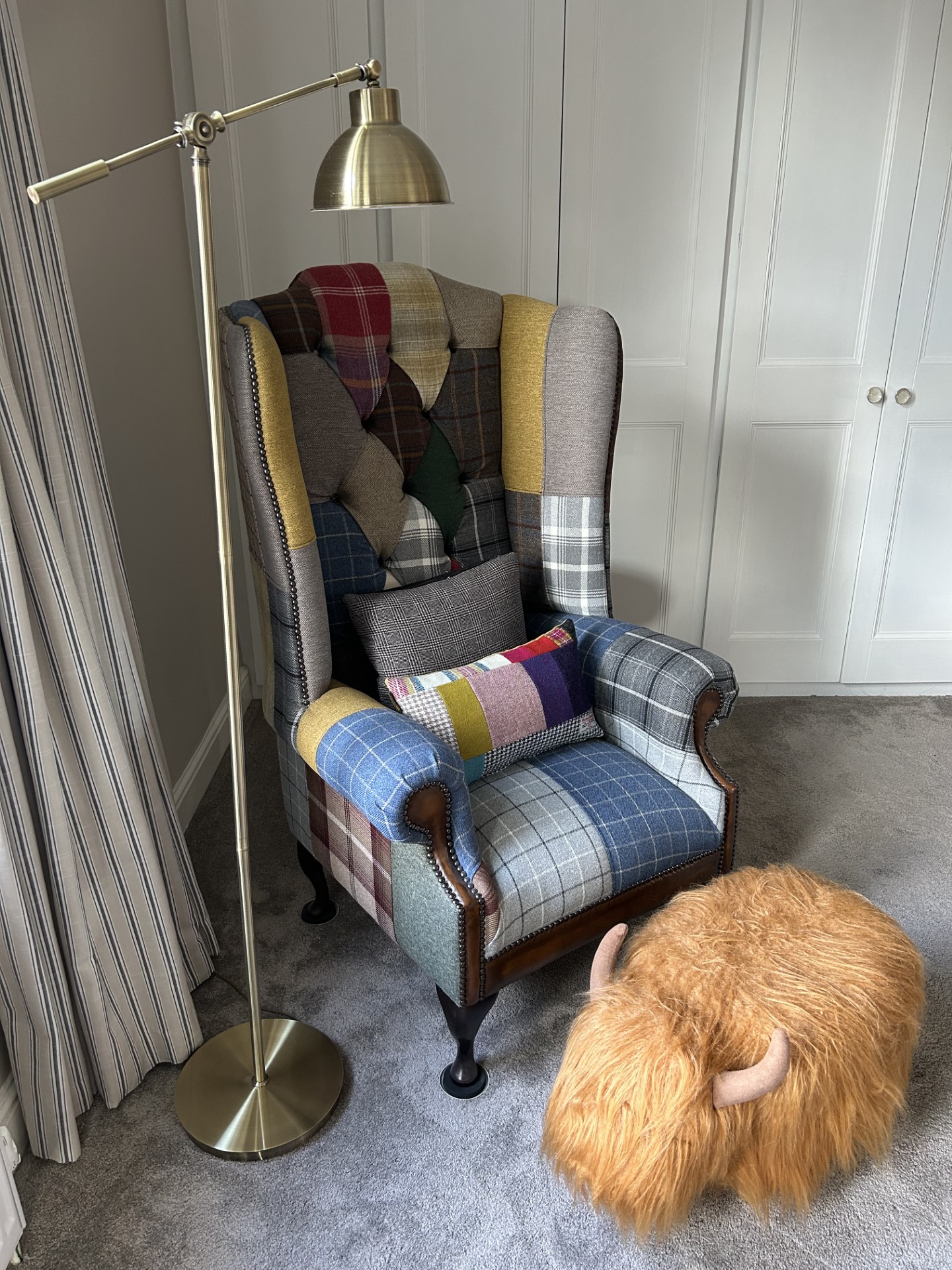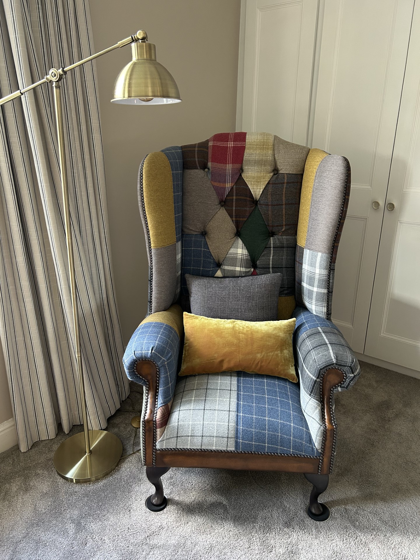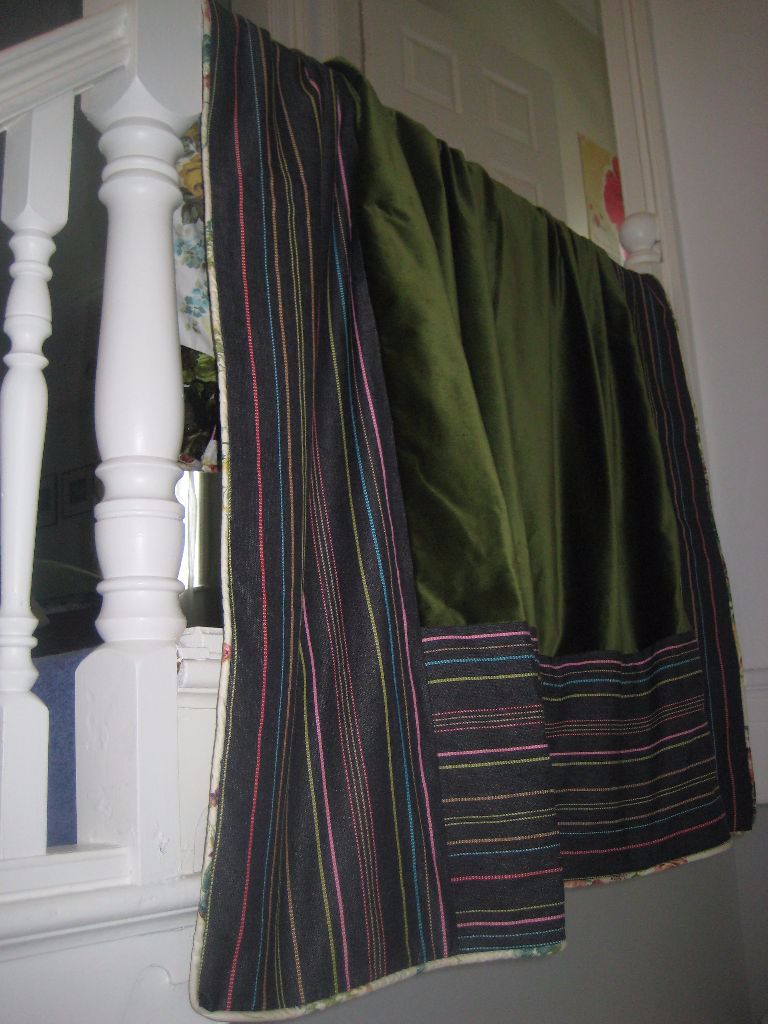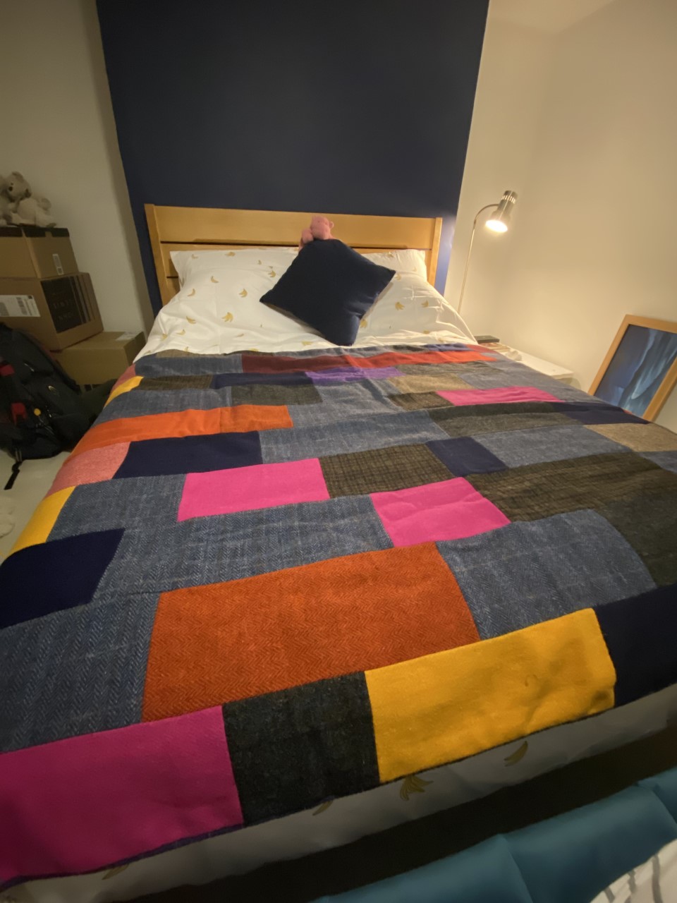 I bought Lisa’s ‘sunshine yellow velvet and subtle blues, browns and greys Harris Tweed, quilt. Just love the fabrics, colour combinations and the workmanship is superb.