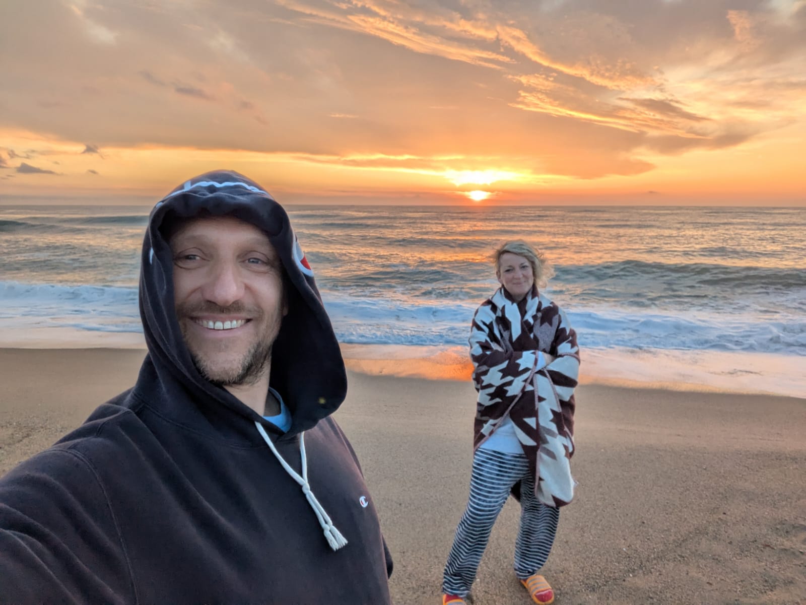From Fi April 2025: Early mornings at Argelès-sur-Mer in France and feeling cosy and warm in our new wool Houndstooth Blanket x