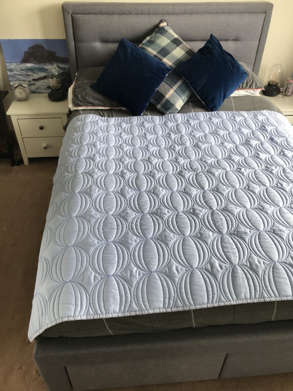 I am so pleased with my beautiful quilt. The colours are lovely and they tone in really well with our bedroom colours.